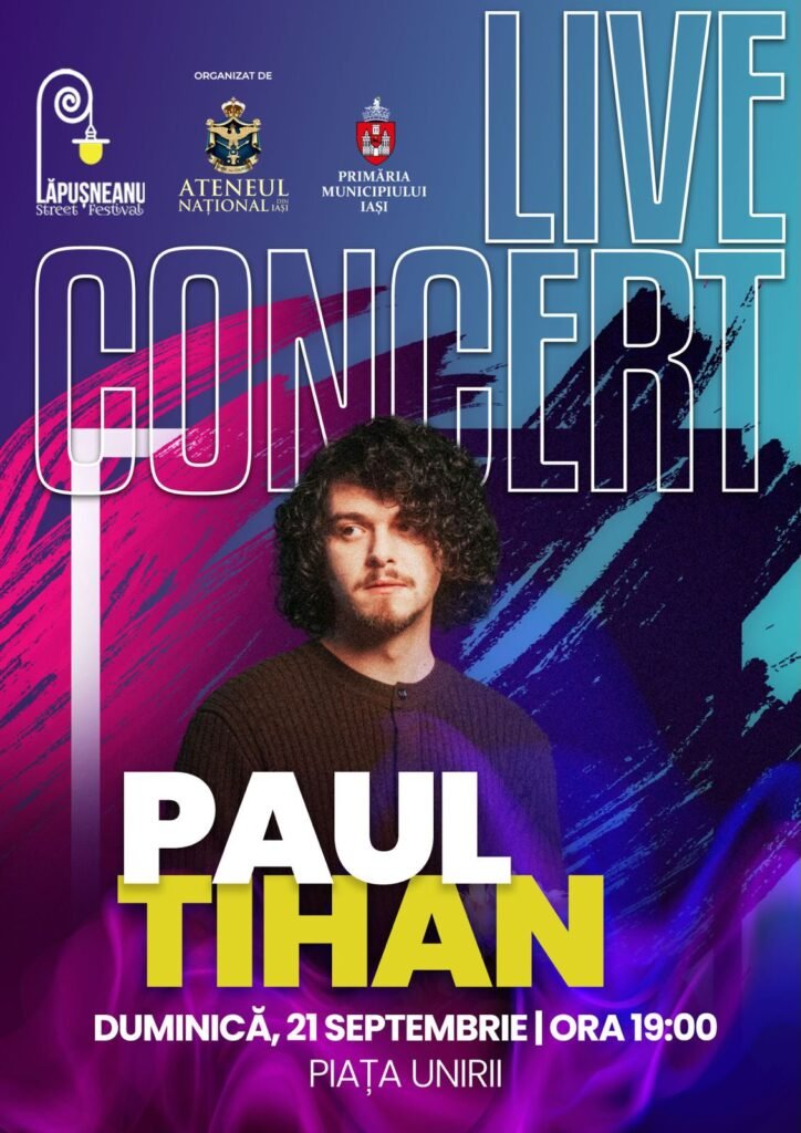 🎶 Duminică, 21 septembrie, de la ora 19:00, Piața Unirii din Iași devine locul în care muzica prinde viață alături de Paul Tihan – live în inima orașului! 💙